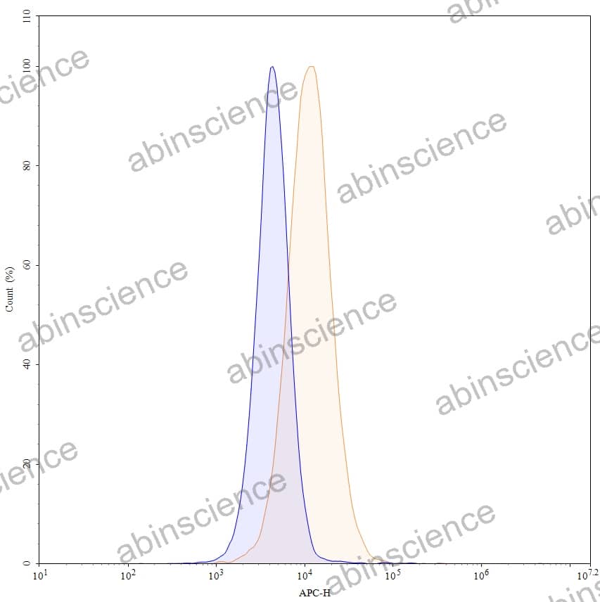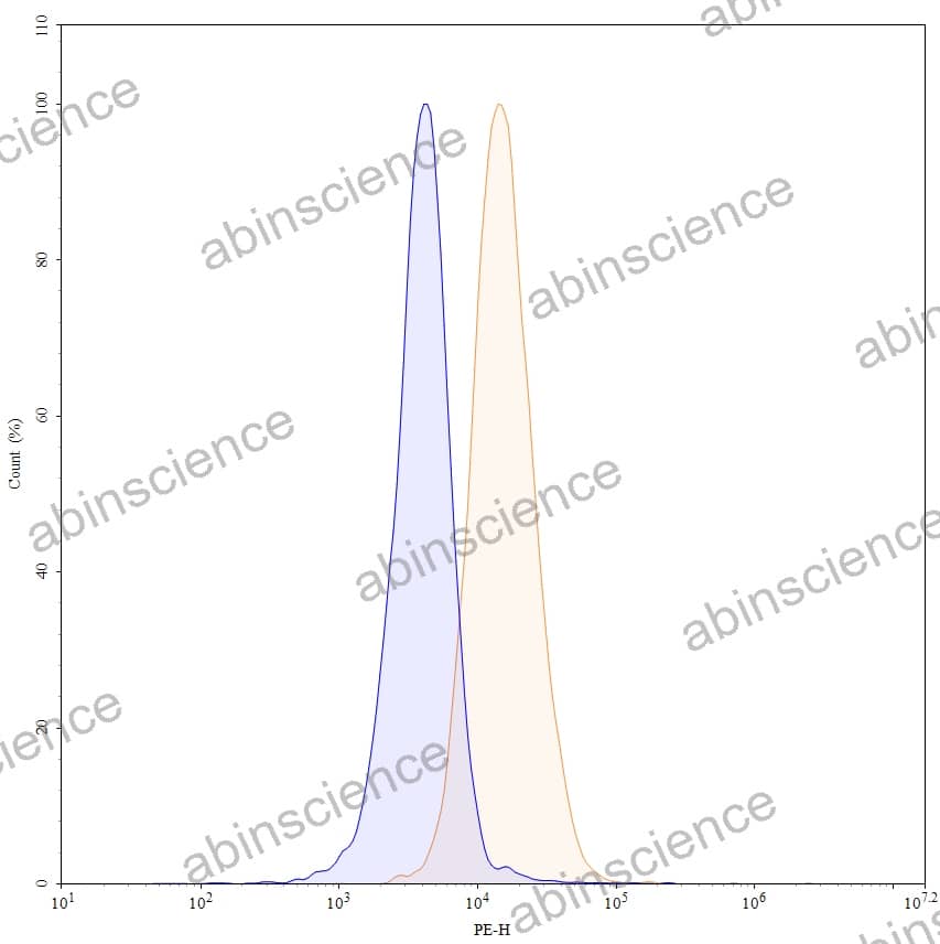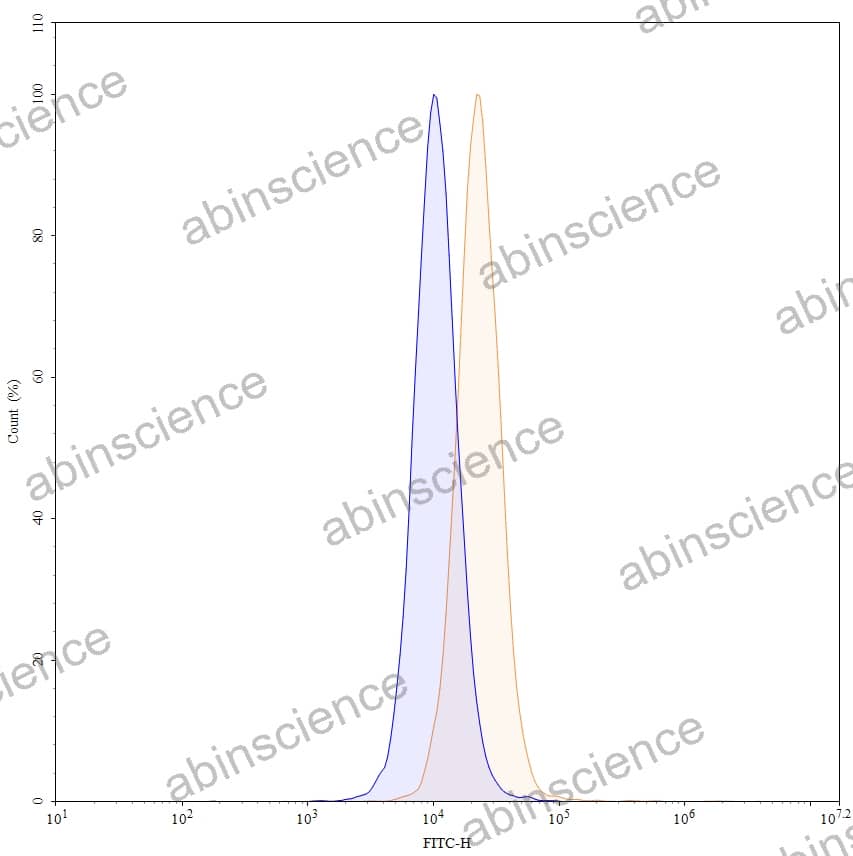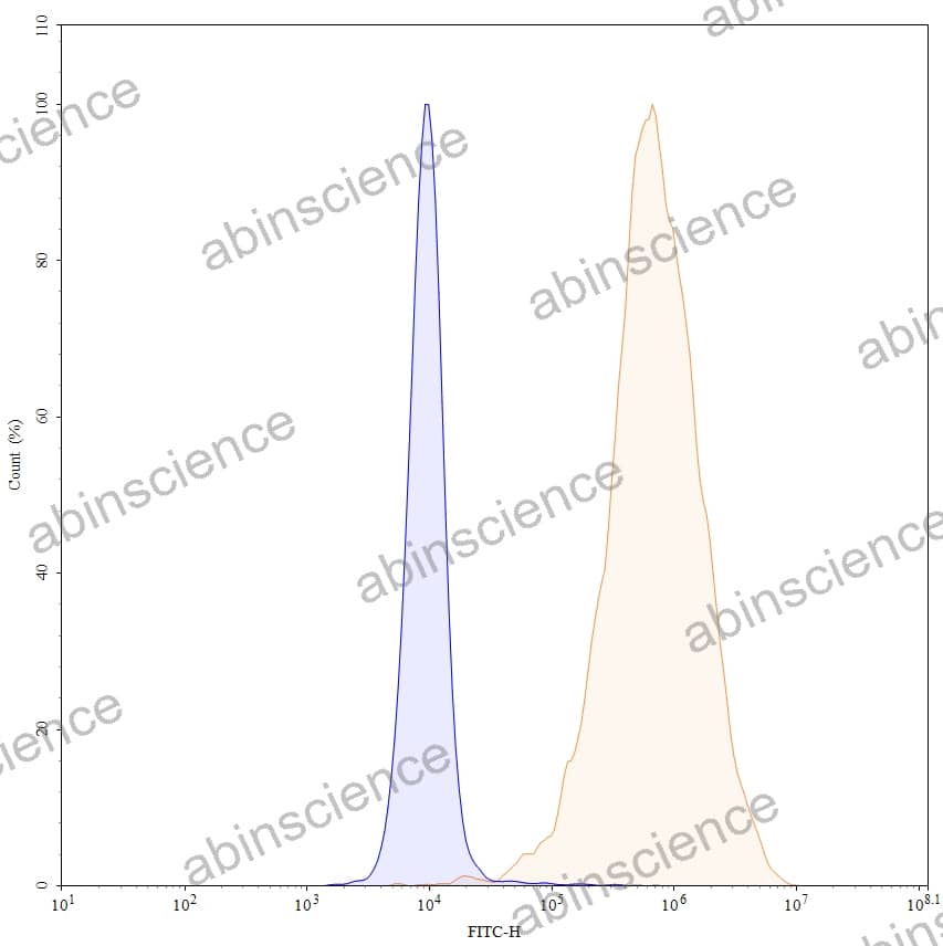Flow-cytometry using anti-human CD274 antibody. Untransfected cells (blue Histogram) and Transfected cells (Yellow Histogram) were stained with an anti-human CD274 monoclonal antibody (Catalog: HV974063) at a concentration of 5 µg/ml for 30 mins at RT. After washing, bound antibody was detected using a Goat Anti-Human IgG H&L Polyclonal Antibody, FITC (abinScience: HF690414) and cells analysed on a NovoCyte Flow Cytometer. |