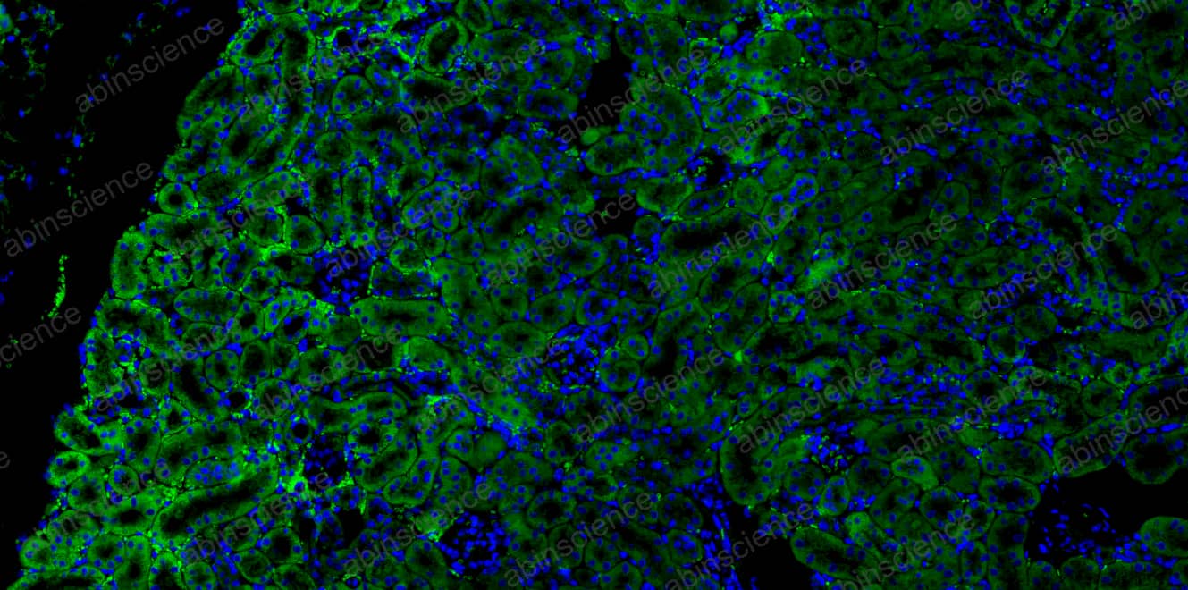 Mouse kidney tissue section stained by immunofluorescence showing PINK1 protein (green) mainly in renal tubules, with nuclei counterstained by DAPI (blue). |