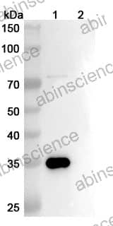 Western blot analysis was performed using anti-/ monoclonal antibody at 1ug/mL on various samples. Lane 1: recombinant Staphylococcus aureus Alpha-toxin/hly(Catalog No: JN998012) Lane 2: negative control