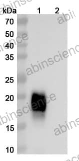 Western blot analysis was performed using anti-/ monoclonal antibody at 1ug/mL on various samples. Lane 1: recombinant Cat Fel d 1(Catalog No: FC088011) Lane 2: negative control