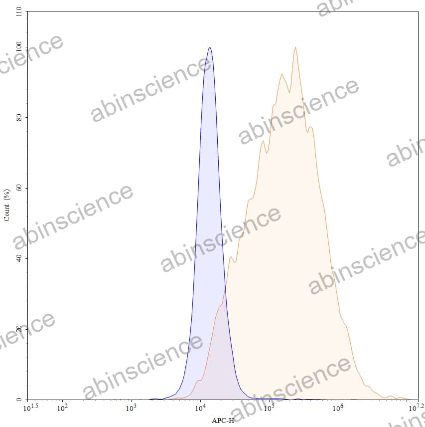 Flow-cytometry using anti-human CLDN18.2 antibody. Untransfected cells (blue Histogram) and Transfected cells (Yellow Histogram) were stained with an anti-human CLDN18.2 monoclonal antibody (Catalog: HX126046) at a concentration of 5 µg/ml for 30 mins at RT. After washing, bound antibody was detected using a Goat Anti-Human IgG H&L Polyclonal Antibody, AF647 (abinScience: HF690324) and cells analysed on a NovoCyte Flow Cytometer. |