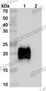 Western blot analysis was performed using anti-CD152/CTLA4 monoclonal antibody at 1ug/mL on various samples. Lane 1: recombinant human CD152/CTLA4 (Catalog No: HB651011) Lane 2: negative control