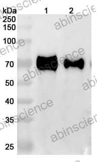 Western blot analysis was performed using anti-GFRAL monoclonal antibody at 1μg/ml on various samples. Lane 1: recombinant human GFRAL (Catalog No: HS720011), 50ng Lane 2: recombinant human GFRAL (Catalog No: HS720011), 30ng