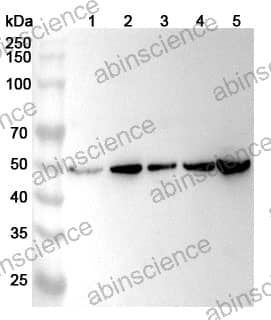 Western blot analysis was performed using anti-FECH polyclonal antibody at 1ug/mL on various samples. Lane 1: HepG2 cell lysate Lane 2: K562 cell lysate Lane 3: HT-29 cell lysate Lane 4: Jurkat cell lysate Lane 5: Mouse brain lysate