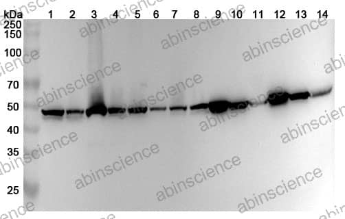 Western blot analysis was performed using anti-ACTR3 polyclonal antibody at 1ug/mL on various samples. Lane 1: A549 cell lysate Lane 2: A431 cell lysate Lane 3: HL60 cell lysate Lane 4: Hela cell lysate Lane 5: Jurkat cell lysate Lane 6: K562 cell lysate Lane 7: PC-3 cell lysate Lane 8: U2OS cell lysate Lane 9: Mouse spleen lysate Lane 10: Mouse lung lysate Lane11: Mouse liver lysate Lane12: Rat spleen lysate Lane13: Rat lung lysate Lane14: Rat liver lysate