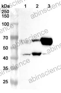 Western blot analysis was performed using anti-CDK9 polyclonal antibody at 1ug/mL on various samples. Lane 1: Mouse lung lysate Lane 2: Rat brain lysate Lane 3: Rat lung lysate