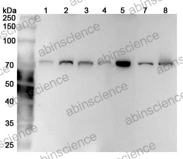 Western blot analysis was performed using anti-LMNB1 polyclonal antibody at 1ug/mL on various samples. Lane 1: Hela cell lysate Lane 2: K562 cell lysate Lane 3: HepG2 cell lysate Lane 4: NIH3T3 cell lysate Lane 5: Mouse spleen lysate Lane 6: Rat spleen lysate Lane 7: Rat testis lysate