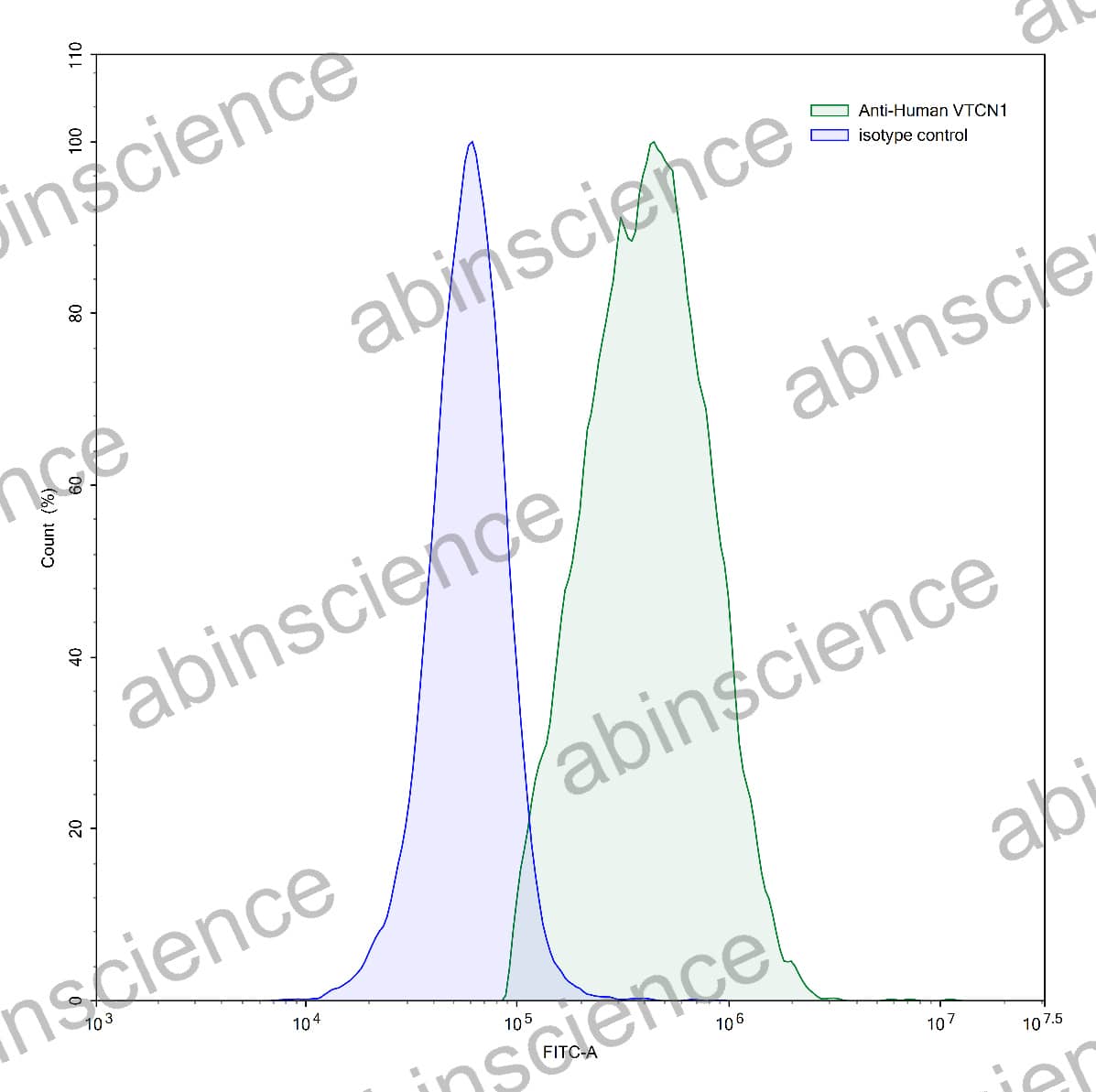 Flow-cytometry using anti-human VTCN1 antibody.SK-BR-3 cells were stained with an irrelevant antibody (Blue Histogram) or an anti-human VTCN1 antibody monoclonal antibody (Catalog # HV721107 ,Green Histogram) at a concentration of 5 µg/ml for 30 mins at RT. After washing, bound antibody was detected using a FITC conjugated goat anti-human antibody (Catalog # HF690414) and cells analysed on a NovoCyte Flow Cytometer. |