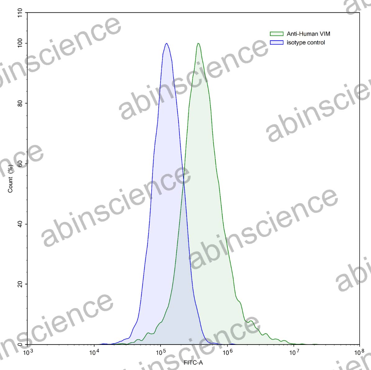 Flow-cytometry using anti-human VIM antibody.VIM/Vimentin Transfected HI5 cells were stained with an irrelevant antibody (Blue Histogram) or an anti-human VIM antibody monoclonal antibody (Catalog # HY550207 ,Green Histogram) at a concentration of 5 µg/ml for 30 mins at RT. After washing, bound antibody was detected using a FITC conjugated goat anti-mouse antibody (Catalog # MF690414) and cells analysed on a NovoCyte Flow Cytometer. |