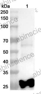 Western blot analysis was performed using anti-SFTSV-NP polyclonal antibody at 1ug/mL on various samples. Lane 1: recombinant SFTSV NP/Nucleoprotein (Catalog No: VK702012)