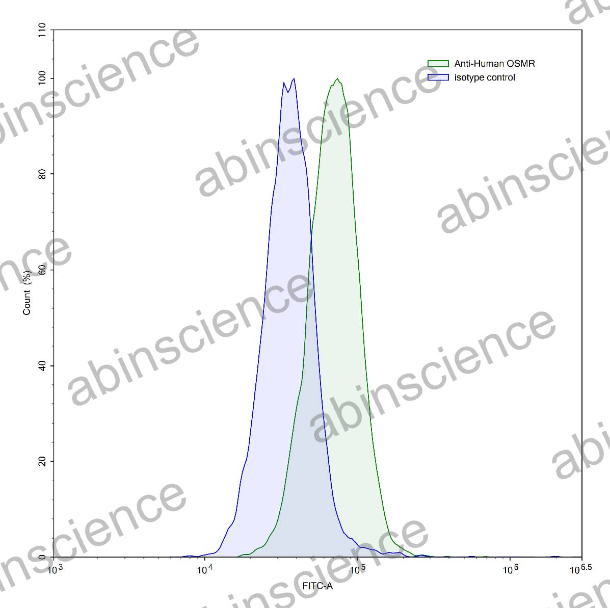 Flow-cytometry using anti-human OSMR antibody.HeLa cells were stained with an irrelevant antibody (Blue Histogram) or an anti-human OSMR antibody monoclonal antibody (Catalog # HV716107 ,Green Histogram) at a concentration of 5 µg/ml for 30 mins at RT. After washing, bound antibody was detected using a FITC conjugated goat anti-human antibody (Catalog # HF690414) and cells analysed on a NovoCyte Flow Cytometer. |