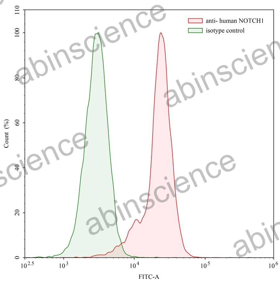 Flow-cytometry using anti-human NOTCH1 antibody. Human MOLT-4 cell line were stained with an irrelevant antibody (Green Histogram) or an anti-human NOTCH1 antibody monoclonal antibody (Catalog # HW570107 , Red Histogram) at a concentration of 5 µg/ml for 30 mins at RT. After washing, bound antibody was detected using a FITC conjugated goat anti-human antibody (Catalog # HF690414) and cells analysed on a NovoCyte Flow Cytometer.