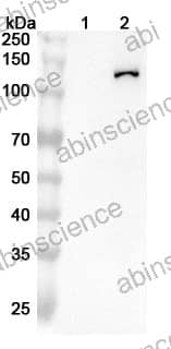 Western blot analysis was performed using anti-INOS monoclonal antibody at 1ug/mL on various samples. Lane 1: RAW264.7 cell lystae Lane 2: RAW264.7+LPS cell lystae