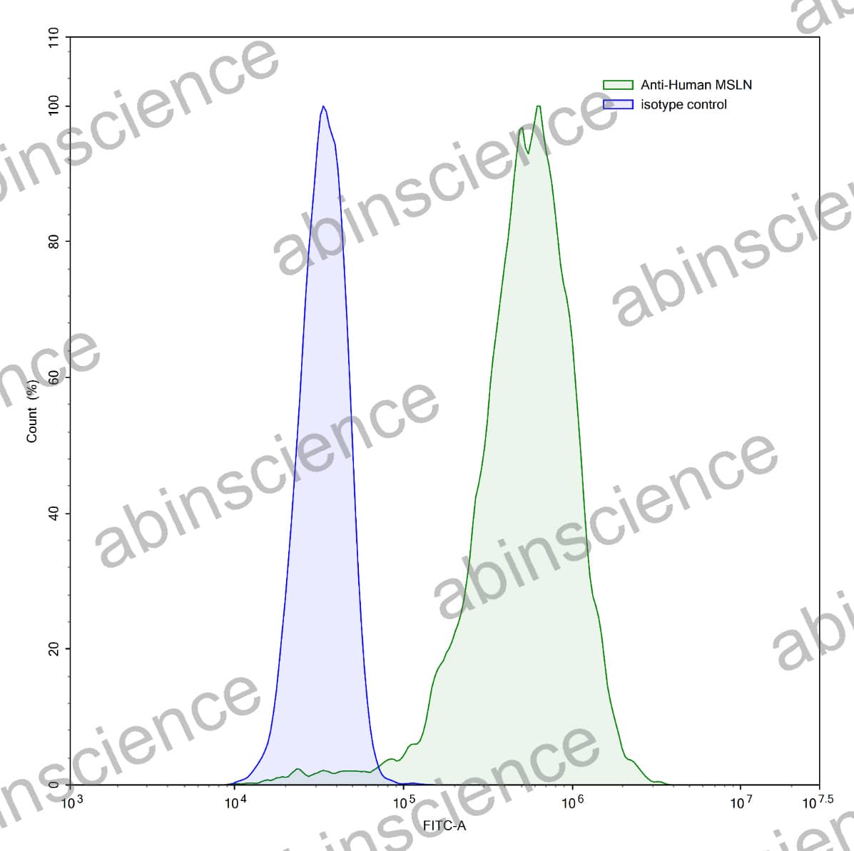 Flow-cytometry using anti-human MSLN antibody.HeLa cells were stained with an irrelevant antibody (Blue Histogram) or an anti-human MSLN antibody monoclonal antibody (Catalog # HC496107 ,Green Histogram) at a concentration of 5 µg/ml for 30 mins at RT. After washing, bound antibody was detected using a FITC conjugated goat anti-mouse antibody (Catalog # MF690414) and cells analysed on a NovoCyte Flow Cytometer. |