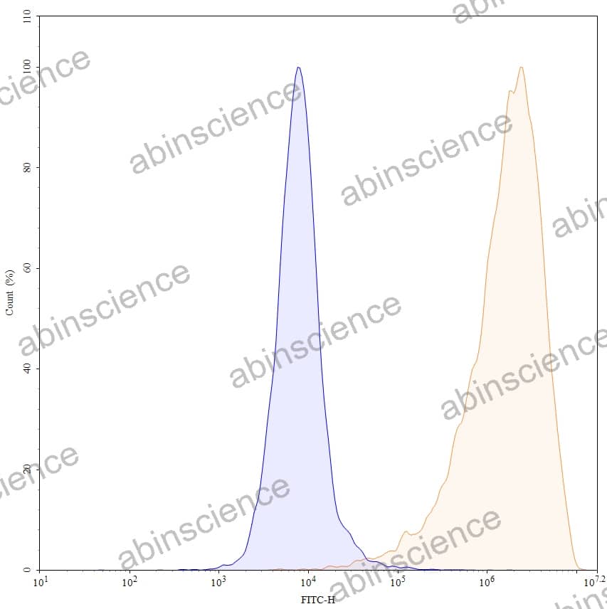 Flow-cytometry using anti-human MSLN antibody. Untransfected cells (blue Histogram) and Transfected cells (Yellow Histogram) were stained with an anti-human MSLN monoclonal antibody (Catalog: HC496107) at a concentration of 5 µg/ml for 30 mins at RT. After washing, bound antibody was detected using a Goat Anti-Mouse IgG H&L Polyclonal Antibody, FITC (abinScience: MF690414) and cells analysed on a NovoCyte Flow Cytometer. |