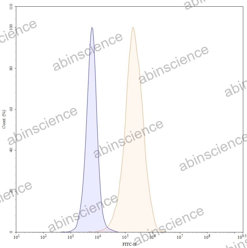 Flow-cytometry using anti-human MICA antibody. Untransfected cells (blue Histogram) and Transfected cells (Yellow Histogram) were stained with an anti-human MICA monoclonal antibody (Catalog: HS894107) at a concentration of 5 µg/ml for 30 mins at RT. After washing, bound antibody was detected using a Goat Anti-Human IgG H&L Polyclonal Antibody, FITC (abinScience: HF690414) and cells analysed on a NovoCyte Flow Cytometer. |
