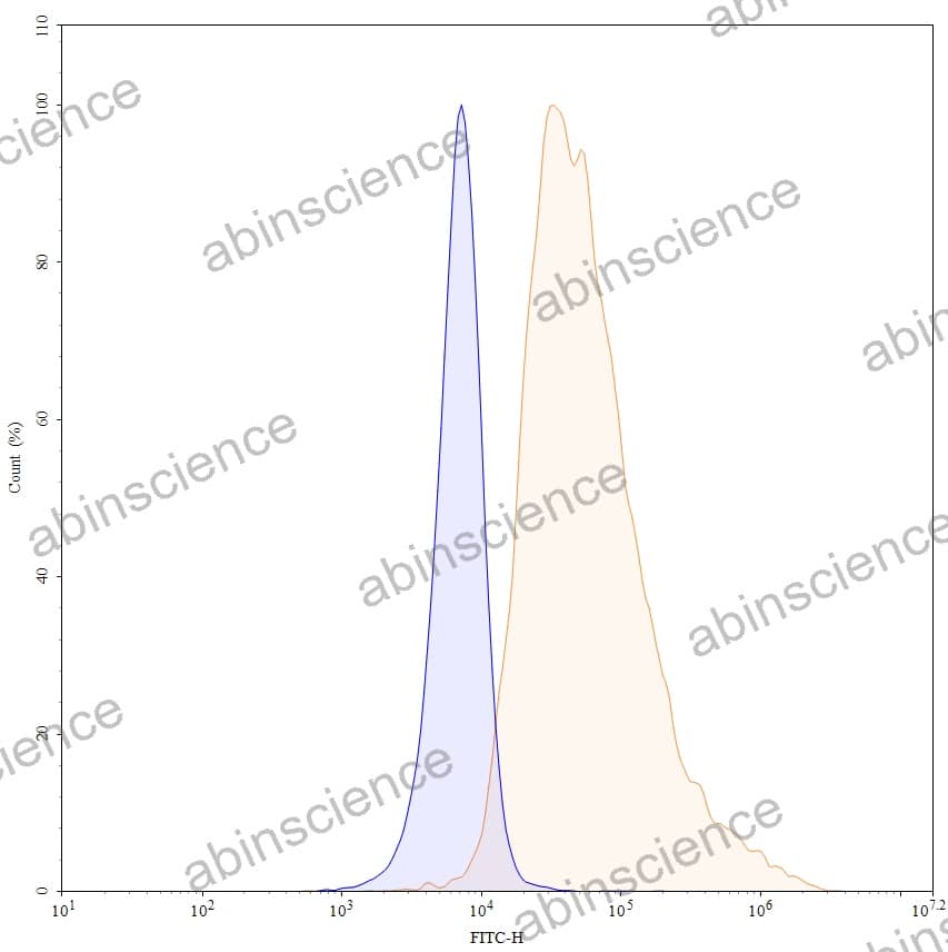 Flow-cytometry using anti-human FOLH1 antibody. Untransfected cells (blue Histogram) and Transfected cells (Yellow Histogram) were stained with an anti-human FOLH1 monoclonal antibody (Catalog: HC669107) at a concentration of 5 µg/ml for 30 mins at RT. After washing, bound antibody was detected using a Goat Anti-Human IgG H&L Polyclonal Antibody, FITC (abinScience: HF690414) and cells analysed on a NovoCyte Flow Cytometer. |