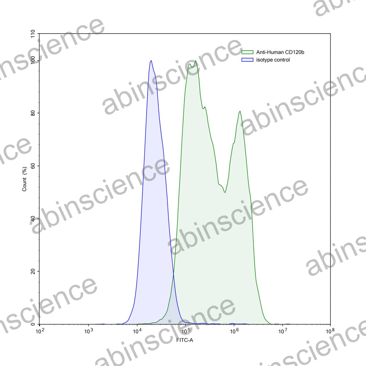 Flow-cytometry using anti-human CD120b antibody. CD120b Transfected CHO cells were stained with an irrelevant antibody (Blue Histogram) or an anti-human CD120b antibody monoclonal antibody (Catalog # HB070107 , Green Histogram) at a concentration of 5 µg/ml for 30 mins at RT. After washing, bound antibody was detected using a FITC conjugated goat anti-mouse antibody (Catalog # MF690414) and cells analysed on a NovoCyte Flow Cytometer.