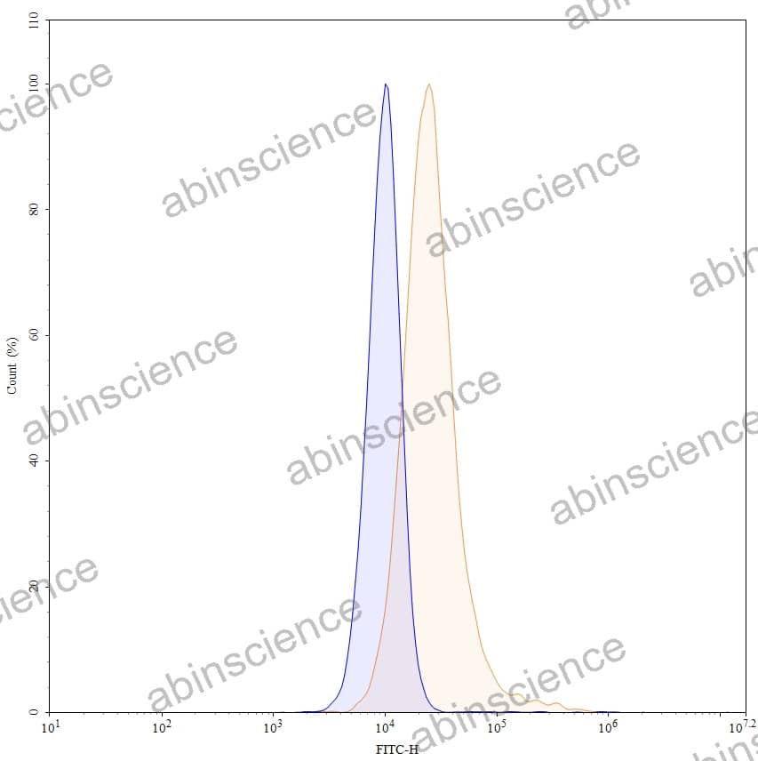 Flow-cytometry using anti-human CD120b antibody. HEK-Blue™ TNF-α cells were stained with an irrelevant antibody (Blue Histogram) or an anti-human CD120b monoclonal antibody (Catalog: HB070107, Yellow Histogram) at a concentration of 5 µg/ml for 30 mins at RT. After washing, bound antibody was detected using a a Goat Anti-Mouse IgG H&L Polyclonal Antibody, FITC (abinScience: MF690414) and cells analysed on a NovoCyte Flow Cytometer. |