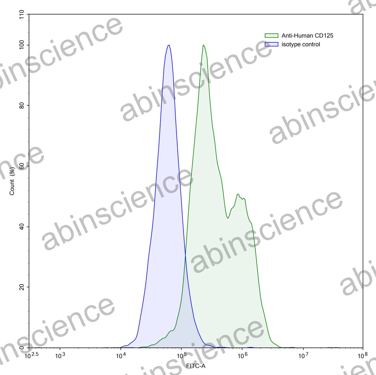 Flow-cytometry using anti-human CD125 antibody.CD125 Transfected CHO cells were stained with an irrelevant antibody (Blue Histogram) or an anti-human CD125 antibody monoclonal antibody (Catalog # HX243107 ,Green Histogram) at a concentration of 5 µg/ml for 30 mins at RT. After washing, bound antibody was detected using a FITC conjugated goat anti-mouse antibody (Catalog # MF690414) and cells analysed on a NovoCyte Flow Cytometer. |