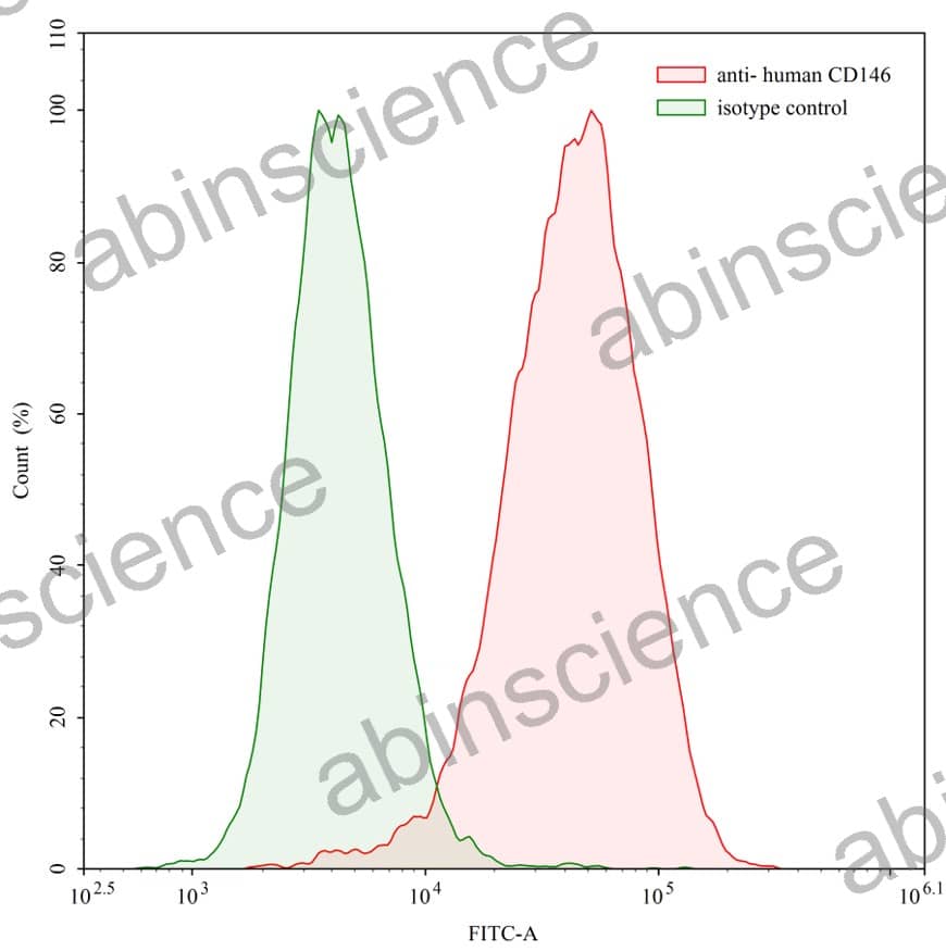 Flow-cytometry using anti-human CD146 antibody. Human HeLa cell line were stained with an irrelevant antibody (Green Histogram) or an anti-human CD146 antibody monoclonal antibody (Catalog # HW484207 , Red Histogram) at a concentration of 5 µg/ml for 30 mins at RT. After washing, bound antibody was detected using a FITC conjugated goat anti-human antibody (Catalog # HF690414) and cells analysed on a NovoCyte Flow Cytometer.