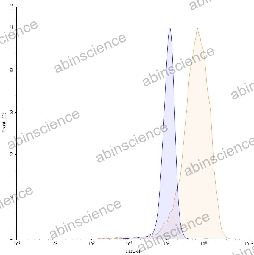 Flow-cytometry using anti-human CD166 antibody. Untransfected cells (blue Histogram) and Transfected cells (Yellow Histogram) were stained with an anti-human CD166 monoclonal antibody (Catalog: HC678107) at a concentration of 5 µg/ml for 30 mins at RT. After washing, bound antibody was detected using a Goat Anti-Mouse IgG H&L Polyclonal Antibody, FITC (abinScience: MF690414) and cells analysed on a NovoCyte Flow Cytometer. |