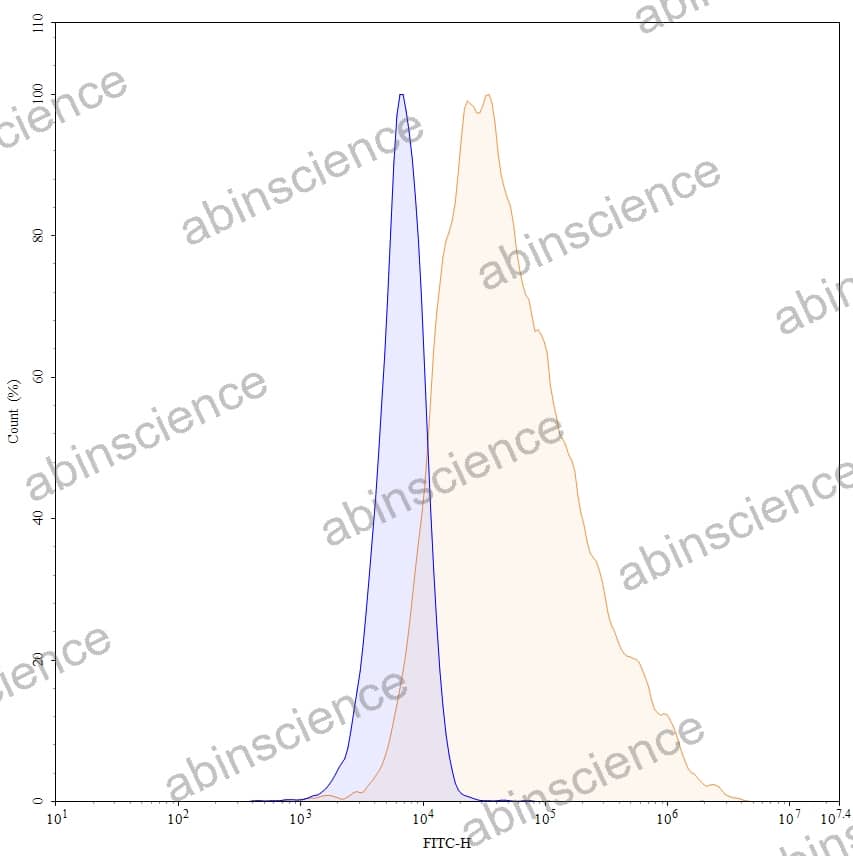 Flow-cytometry using anti-human CD193 antibody. Untransfected cells (blue Histogram) and Transfected cells (Yellow Histogram) were stained with an anti-human CD193 monoclonal antibody (Catalog: HW620107) at a concentration of 5 µg/ml for 30 mins at RT. After washing, bound antibody was detected using a Goat Anti-Mouse IgG H&L Polyclonal Antibody, FITC (abinScience: MF690414) and cells analysed on a NovoCyte Flow Cytometer. |