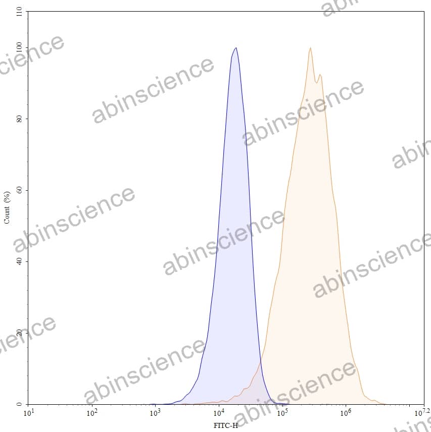 Flow-cytometry using anti-human CD196 antibody. Untransfected cells (blue Histogram) and Transfected cells (Yellow Histogram) were stained with an anti-human CD196 monoclonal antibody (Catalog: HW383107) at a concentration of 5 µg/ml for 30 mins at RT. After washing, bound antibody was detected using a Goat Anti-Mouse IgG H&L Polyclonal Antibody, FITC (abinScience: MF690414) and cells analysed on a NovoCyte Flow Cytometer. |