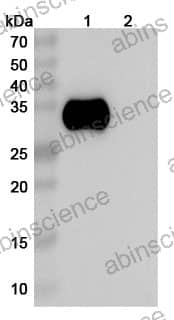 Western blot analysis was performed using anti-CD2 monoclonal antibody at 1ug/mL on various samples. Lane 1: recombinant human CD2 (Catalog No: HY113011) Lane 2: negative control