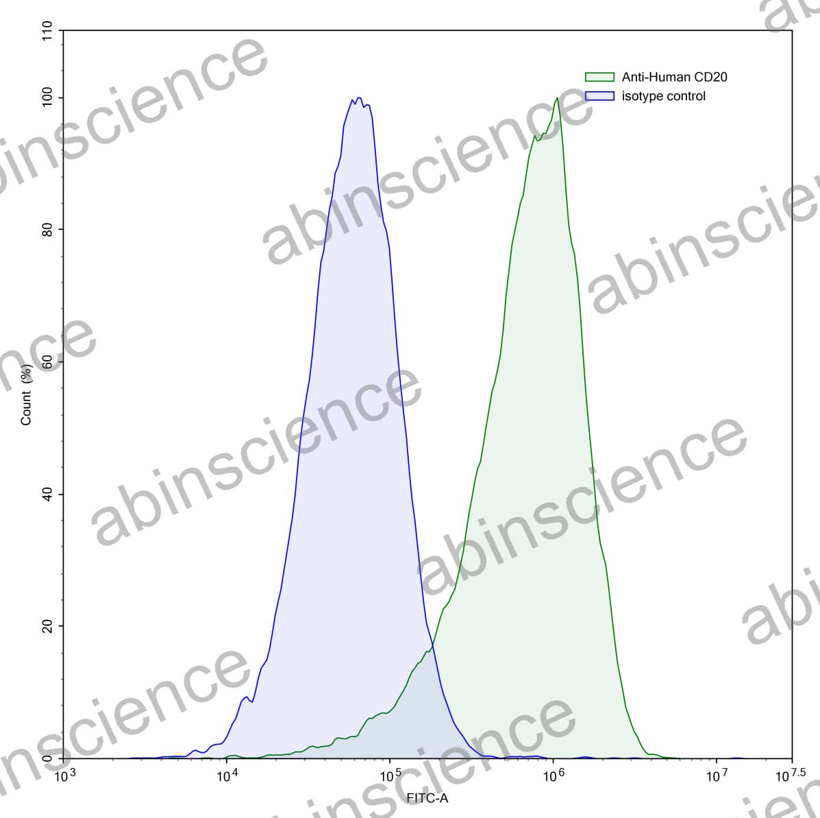 Flow-cytometry using anti-human CD20 antibody.Daudi cells were stained with an irrelevant antibody (Blue Histogram) or an anti-human CD20 antibody monoclonal antibody (Catalog # HY257107 ,Green Histogram) at a concentration of 5 µg/ml for 30 mins at RT. After washing, bound antibody was detected using a FITC conjugated goat anti-mouse antibody (Catalog # MF690414) and cells analysed on a NovoCyte Flow Cytometer. |