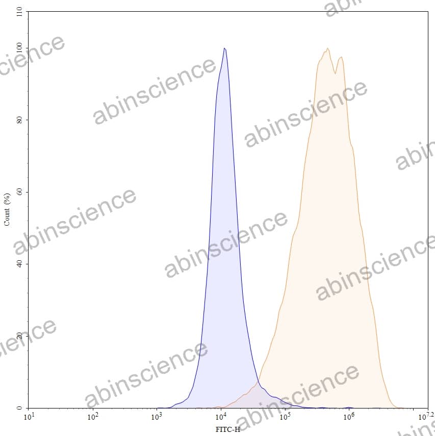 Flow-cytometry using anti-human CD203c antibody. Untransfected cells (blue Histogram) and Transfected cells (Yellow Histogram) were stained with an anti-human CD203c monoclonal antibody (Catalog: HT018107) at a concentration of 5 µg/ml for 30 mins at RT. After washing, bound antibody was detected using a Goat Anti-Mouse IgG H&L Polyclonal Antibody, FITC (abinScience: MF690414) and cells analysed on a NovoCyte Flow Cytometer. |