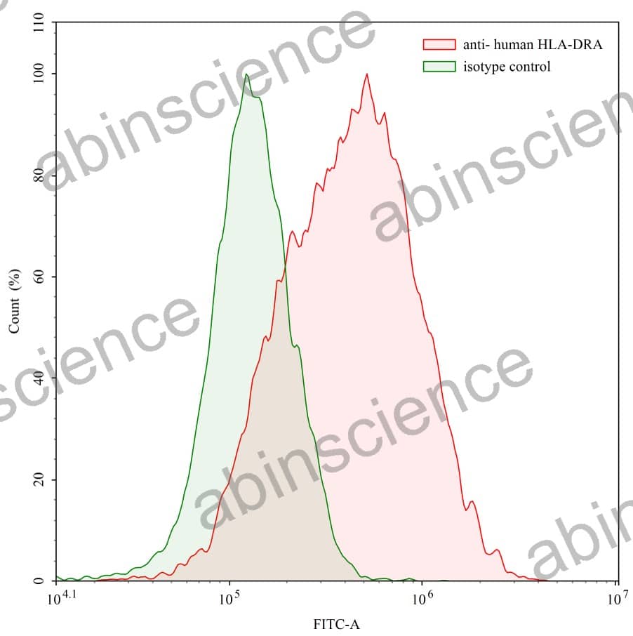 Flow-cytometry using anti-human HLA-DRA antibody. Human U-87 cell line were stained with an irrelevant antibody (Green Histogram) or an anti-human HLA-DRA antibody monoclonal antibody (Catalog # HM812107 , Red Histogram) at a concentration of 20 µg/ml for 30 mins at RT. After washing, bound antibody was detected using a CoraLite488 conjugated goat anti-mouse antibody (Catalog # MF690314) and cells analysed on a NovoCyte Flow Cytometer.
