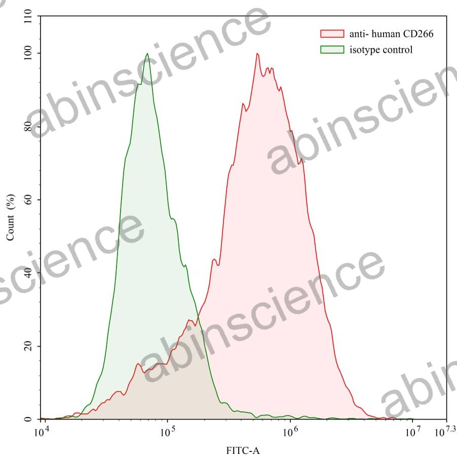 Flow-cytometry using anti-human CD266 antibody. Human U-251 cell line were stained with an irrelevant antibody (Green Histogram) or an anti-human CD266 antibody monoclonal antibody (Catalog # HV811107 , Red Histogram) at a concentration of 20 µg/ml for 30 mins at RT. After washing, bound antibody was detected using a FITC conjugated goat anti-human antibody (Catalog # HF690414) and cells analysed on a NovoCyte Flow Cytometer.