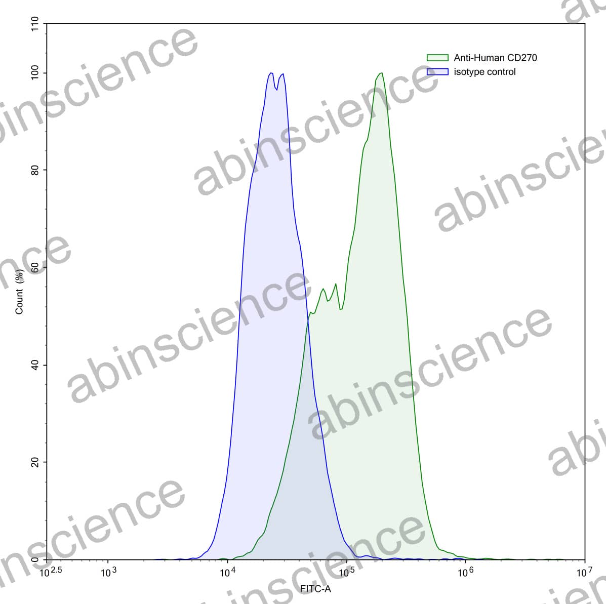 Flow-cytometry using anti-human CD270 antibody.CD270 Transfected CHO cells were stained with an irrelevant antibody (Blue Histogram) or an anti-human CD270 antibody monoclonal antibody (Catalog # HV480107 ,Green Histogram) at a concentration of 5 µg/ml for 30 mins at RT. After washing, bound antibody was detected using a FITC conjugated goat anti-mouse antibody (Catalog # MF690414) and cells analysed on a NovoCyte Flow Cytometer. |