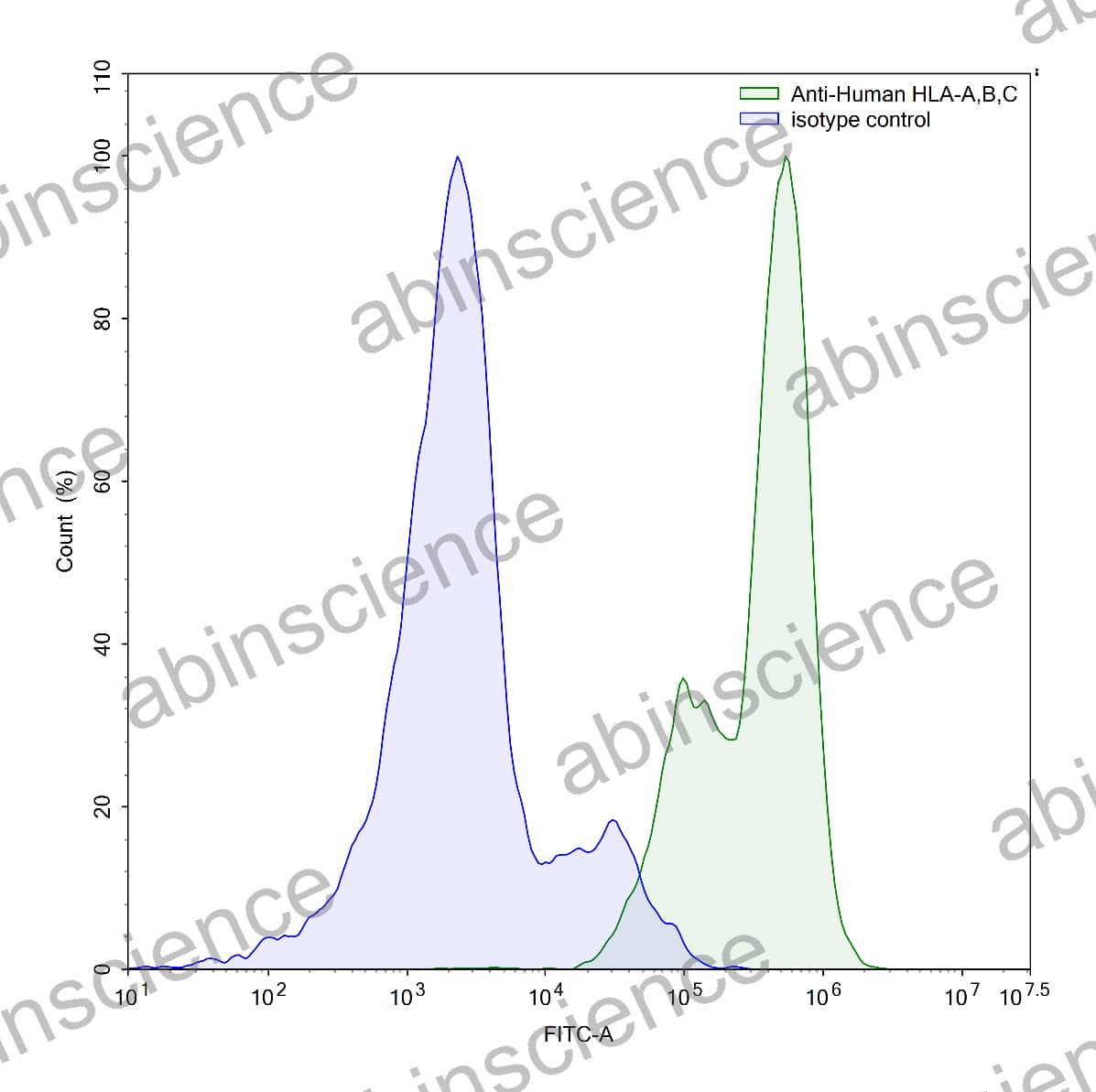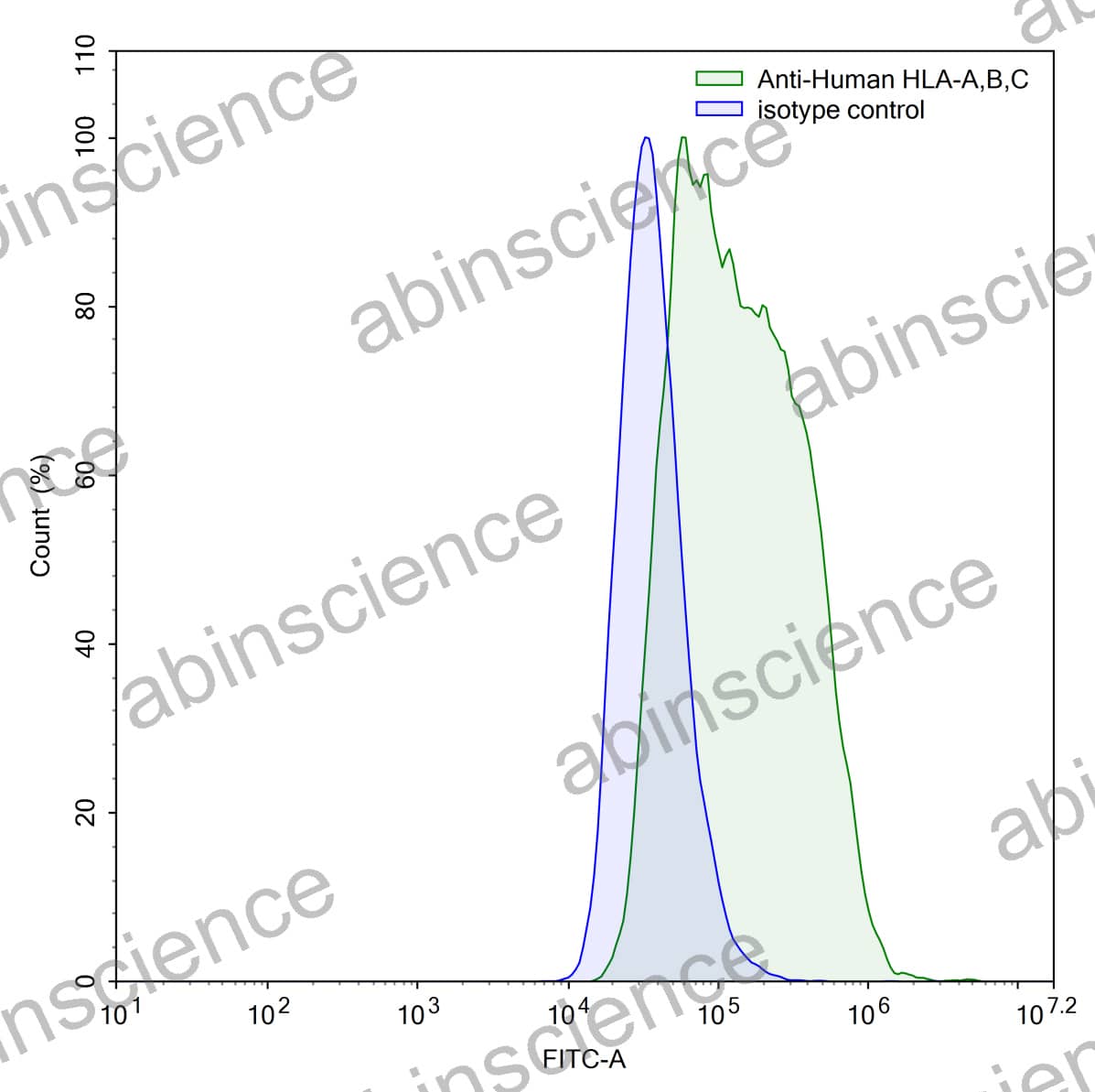 Flow-cytometry using anti-human HLA-A,B,C Monomorphic antibody.K562 cells were stained with an irrelevant antibody (Blue Histogram) or an anti-human HLA-A,B,C Monomorphic antibody monoclonal antibody (Catalog # HM834107 ,Green Histogram) at a concentration of 5 µg/ml for 30 mins at RT. After washing, bound antibody was detected using a FITC conjugated goat anti-mouse antibody (Catalog # MF690414) and cells analysed on a NovoCyte Flow Cytometer. |