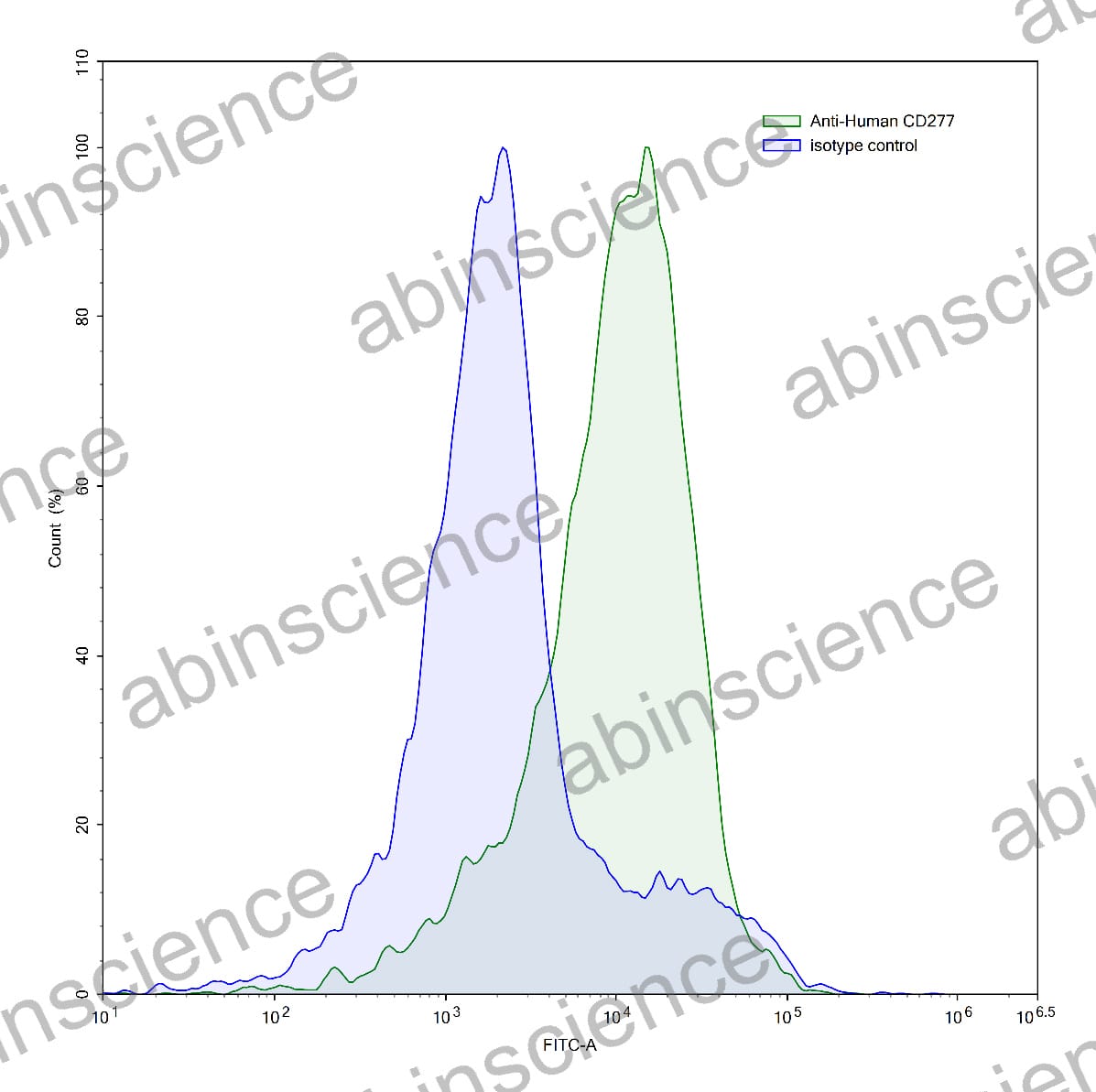 Flow-cytometry using anti-human CD277 antibody.Human peripheral blood lymphocytes were stained with an irrelevant antibody (Blue Histogram) or an anti-human CD277 antibody monoclonal antibody (Catalog # HT139107 ,Green Histogram) at a concentration of 5 ug/ml for 30 mins at RT. After washing, bound antibody was detected using a FITC conjugated goat anti-mouse antibody (Catalog # MF690414) and cells analysed on a NovoCyte Flow Cytometer. |