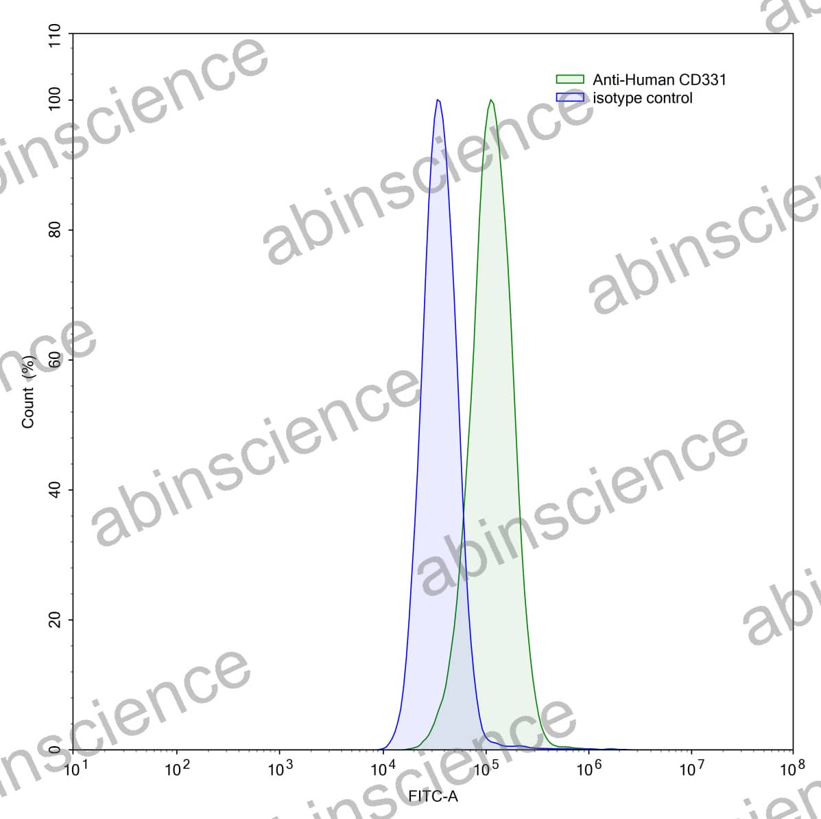 Flow-cytometry using anti-human CD331 antibody.MCF7 cells were stained with an irrelevant antibody (Blue Histogram) or an anti-human CD331 antibody monoclonal antibody (Catalog # HY105107 ,Green Histogram) at a concentration of 5 µg/ml for 30 mins at RT. After washing, bound antibody was detected using a FITC conjugated goat anti-mouse antibody (Catalog # MF690414) and cells analysed on a NovoCyte Flow Cytometer. |