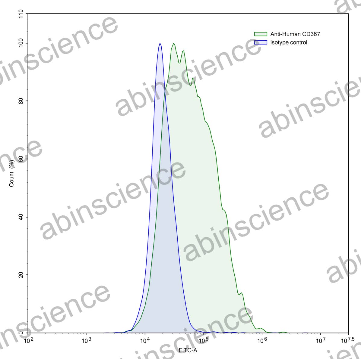 Flow-cytometry using anti-human CD367 antibody.CD367 Transfected CHO cells were stained with an irrelevant antibody (Blue Histogram) or an anti-human CD367 antibody monoclonal antibody (Catalog # HV145107 ,Green Histogram) at a concentration of 5 µg/ml for 30 mins at RT. After washing, bound antibody was detected using a FITC conjugated goat anti-mouse antibody (Catalog # MF690414) and cells analysed on a NovoCyte Flow Cytometer. |