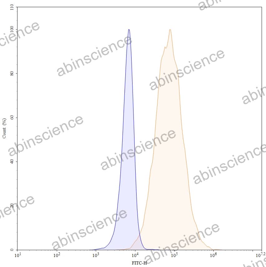 Flow-cytometry using anti-human CD66b antibody. Untransfected cells (blue Histogram) and Transfected cells (Yellow Histogram) were stained with an anti-human CD66b monoclonal antibody (Catalog: HB202107) at a concentration of 5 µg/ml for 30 mins at RT. After washing, bound antibody was detected using a Goat Anti-Mouse IgG H&L Polyclonal Antibody, FITC (abinScience: MF690414) and cells analysed on a NovoCyte Flow Cytometer. |