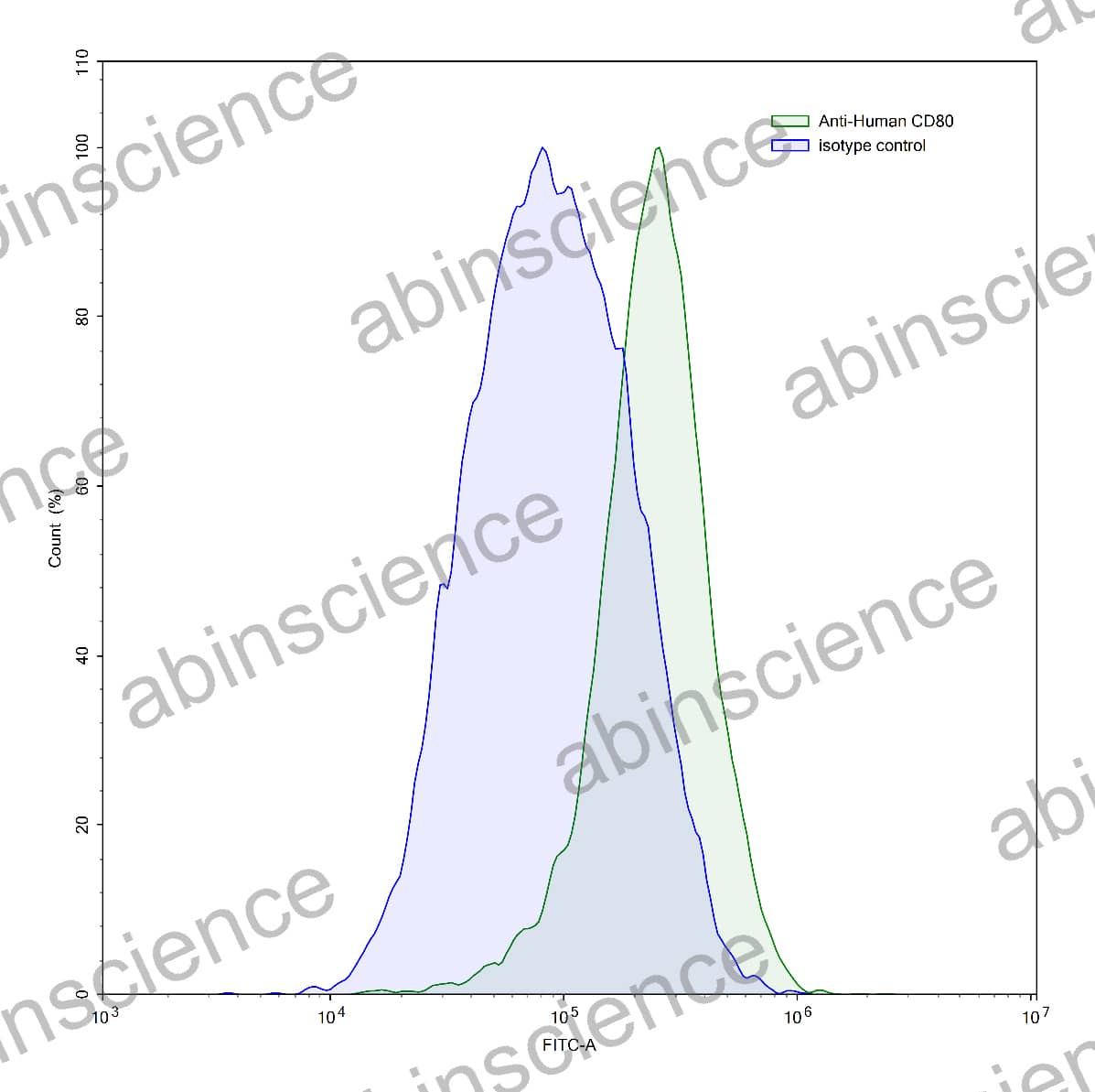 Flow-cytometry using anti-human CD80 antibody.Raji cells were stained with an irrelevant antibody (Blue Histogram) or an anti-human CD80 antibody monoclonal antibody (Catalog # HW630107 ,Green Histogram) at a concentration of 5 µg/ml for 30 mins at RT. After washing, bound antibody was detected using a FITC conjugated goat anti-mouse antibody (Catalog # MF690414) and cells analysed on a NovoCyte Flow Cytometer. |