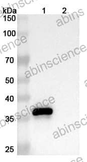Western blot analysis was performed using anti-CD9 monoclonal antibody at 1ug/mL on various samples. Lane 1: recombinant human CD9 (Catalog No: HB984011) Lane 2: negative control