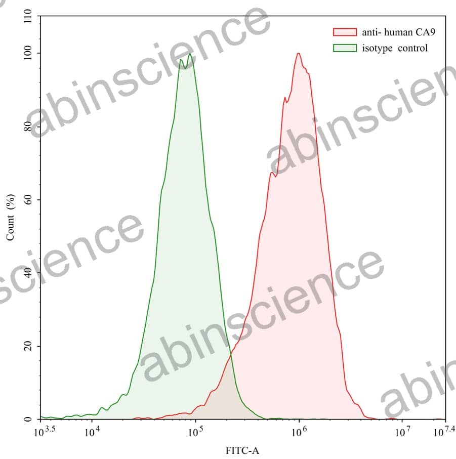Flow-cytometry using anti-human CA9 antibody. Human U-87 cell line were stained with an irrelevant antibody (Green Histogram) or an anti-human CA9 antibody monoclonal antibody (Catalog # HS840107 , Red Histogram) at a concentration of 20 µg/ml for 30 mins at RT. After washing, bound antibody was detected using a FITC conjugated goat anti-human antibody (Catalog # HF690414) and cells analysed on a NovoCyte Flow Cytometer.