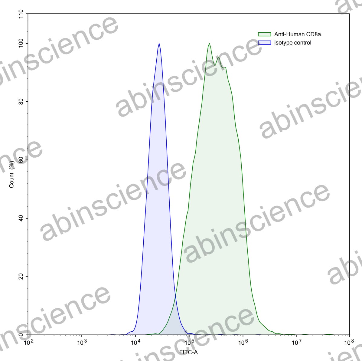 Flow-cytometry using anti-human CD8a antibody.CD8a Transfected CHO cells were stained with an irrelevant antibody (Blue Histogram) or an anti-human CD8a antibody monoclonal antibody (Catalog # HF815207 ,Green Histogram) at a concentration of 5 ug/ml for 30 mins at RT. After washing, bound antibody was detected using a FITC conjugated goat anti-mouse antibody (Catalog # MF690414) and cells analysed on a NovoCyte Flow Cytometer. |