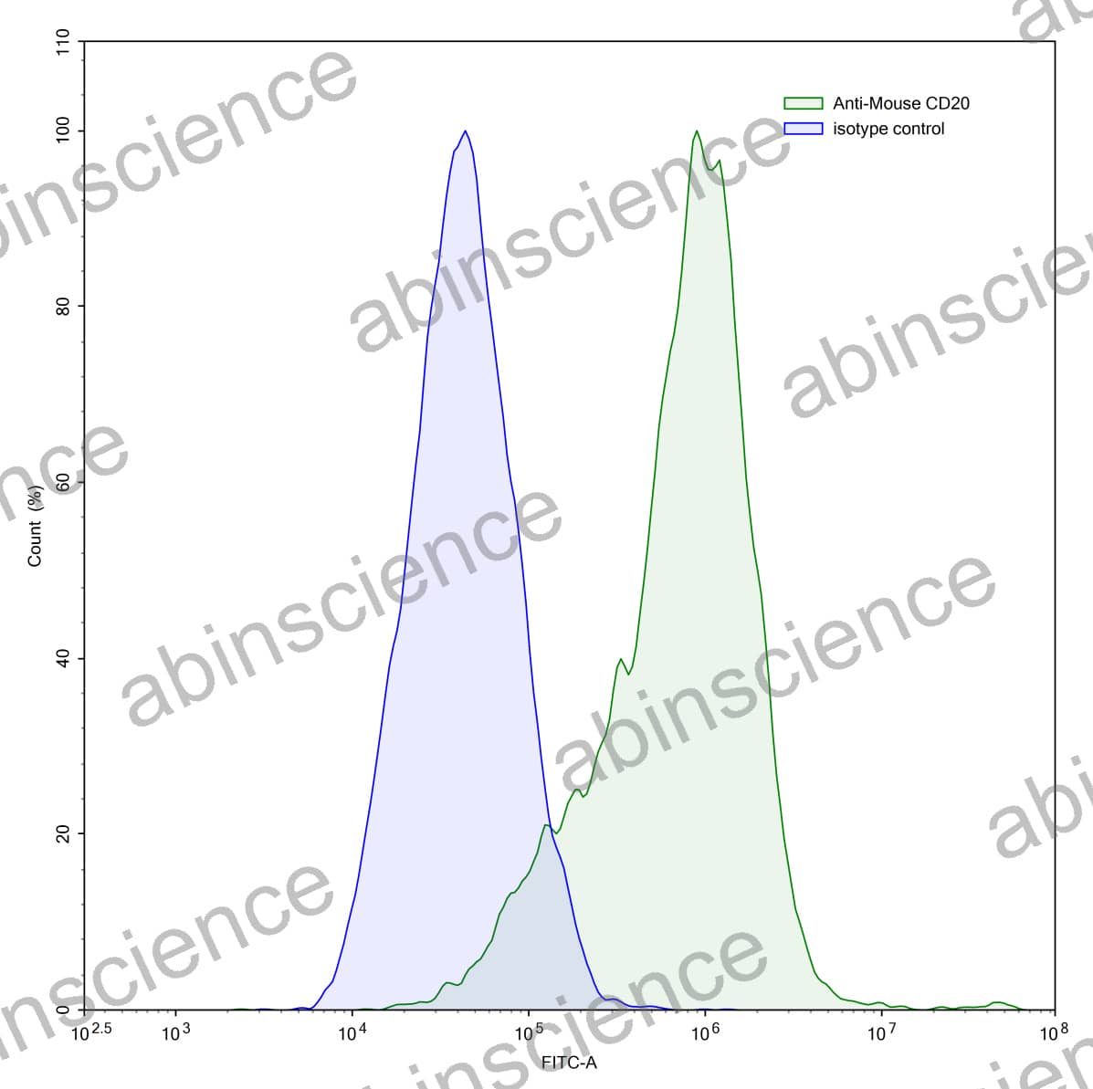 Flow-cytometry using anti-Mouse CD20 antibody.CD20 Transfected CHO cells were stained with an irrelevant antibody (Blue Histogram) or an anti-Mouse CD20 antibody monoclonal antibody (Catalog # MY257107 ,Green Histogram) at a concentration of 5 µg/ml for 30 mins at RT. After washing, bound antibody was detected using a FITC conjugated goat anti-mouse antibody (Catalog # MF690414) and cells analysed on a NovoCyte Flow Cytometer. |