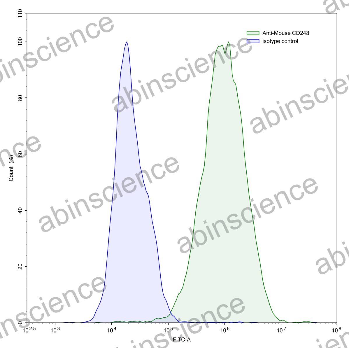 Flow-cytometry using anti-mouse CD248 antibody.CD248 Transfected CHO cells were stained with an irrelevant antibody (Blue Histogram) or an anti-mouse CD248 antibody monoclonal antibody (Catalog # MV681107 ,Green Histogram) at a concentration of 5 µg/ml for 30 mins at RT. After washing, bound antibody was detected using a FITC conjugated goat anti-human antibody (Catalog # HF690414) and cells analysed on a NovoCyte Flow Cytometer. |