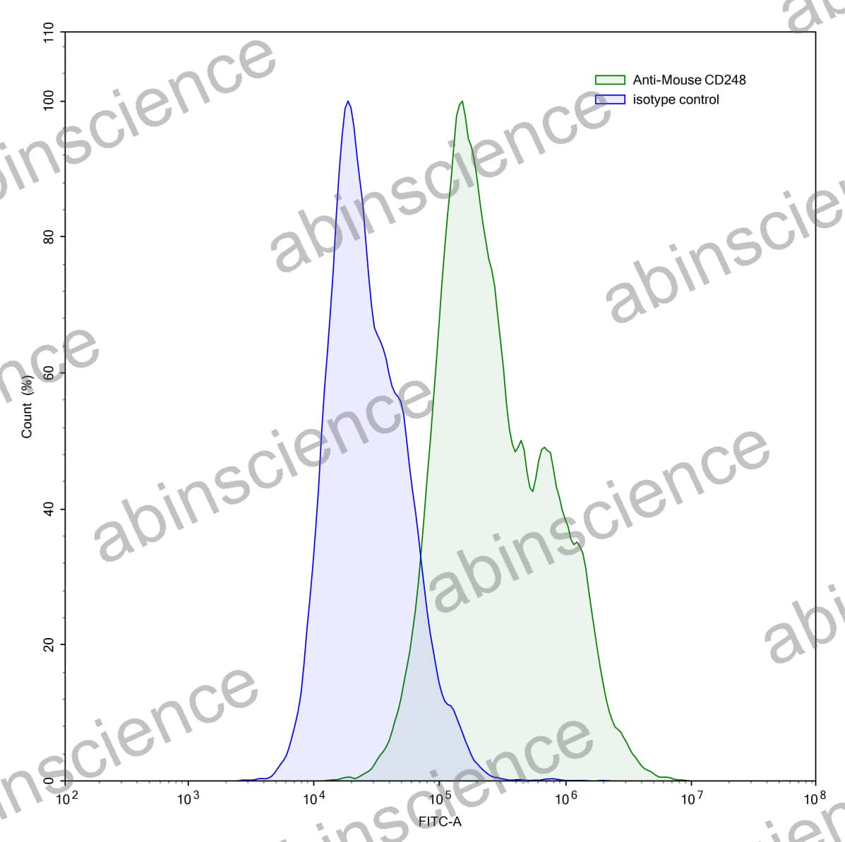 Flow-cytometry using anti-mouse CD248 antibody.CD248 Transfected CHO cells were stained with an irrelevant antibody (Blue Histogram) or an anti-mouse CD248 antibody monoclonal antibody (Catalog # MV681207 ,Green Histogram) at a concentration of 5 µg/ml for 30 mins at RT. After washing, bound antibody was detected using a FITC conjugated goat anti-mouse antibody (Catalog # MF690414) and cells analysed on a NovoCyte Flow Cytometer. |