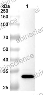 Western blot analysis was performed using anti-FHAB polyclonal antibody at 1ug/mL on various samples. Lane 1: recombinant Bordetella pertussis fhaB/FHA (Catalog No: JN030012)