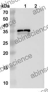 Western blot analysis was performed using anti-monkeypox virus B6R monoclonal antibody at 1ug/mL on various samples. Lane 1: recombinant monkeypox virus B6R (Catalog No: VK526012) Lane 2: negative control
