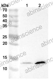 Western blot analysis was performed using anti-H4K5acK8ac monoclonal antibody at 1ug/mL on various samples. Lane 1: 293T cell lysate Lane 2: HCT116 cell lysate