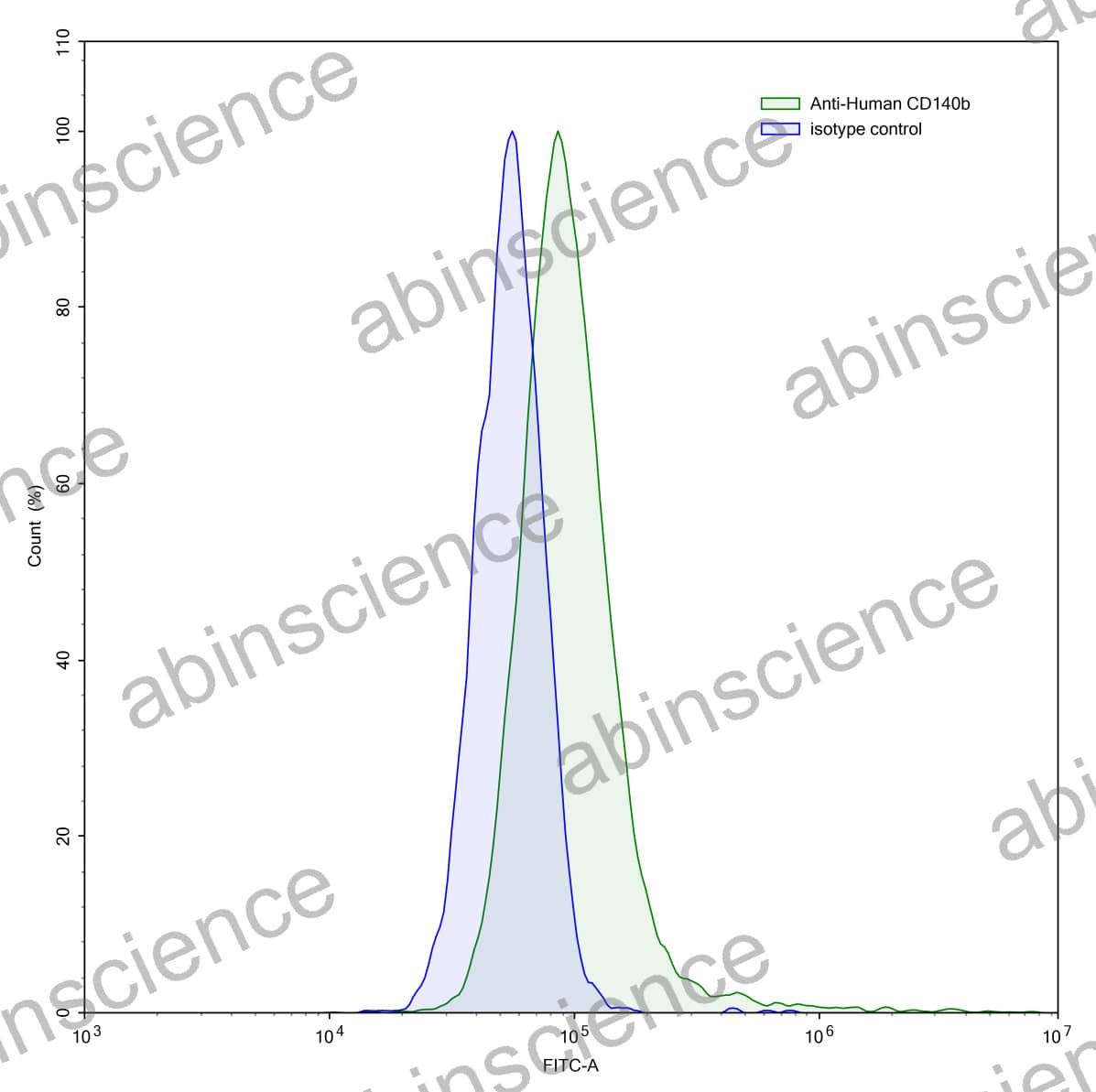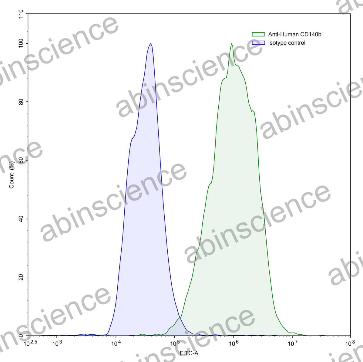 Flow-cytometry using anti-human CD140b antibody.MG-63 cells were stained with an irrelevant antibody (Blue Histogram) or an anti-human CD140b antibody monoclonal antibody (Catalog # HY260207 ,Green Histogram) at a concentration of 5 µg/ml for 30 mins at RT. After washing, bound antibody was detected using a FITC conjugated goat anti-mouse antibody (Catalog # MF690414) and cells analysed on a NovoCyte Flow Cytometer. |